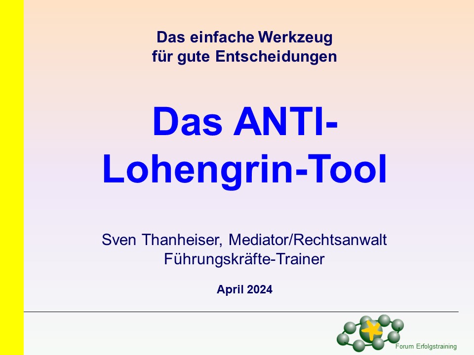 Wenn Sie schlaflose Grübelei abstellen oder Ihre Entscheidungen auf eine breitere Basis stellen möchten, nutzen Sie das ANTI-Lohengrin-Tool!